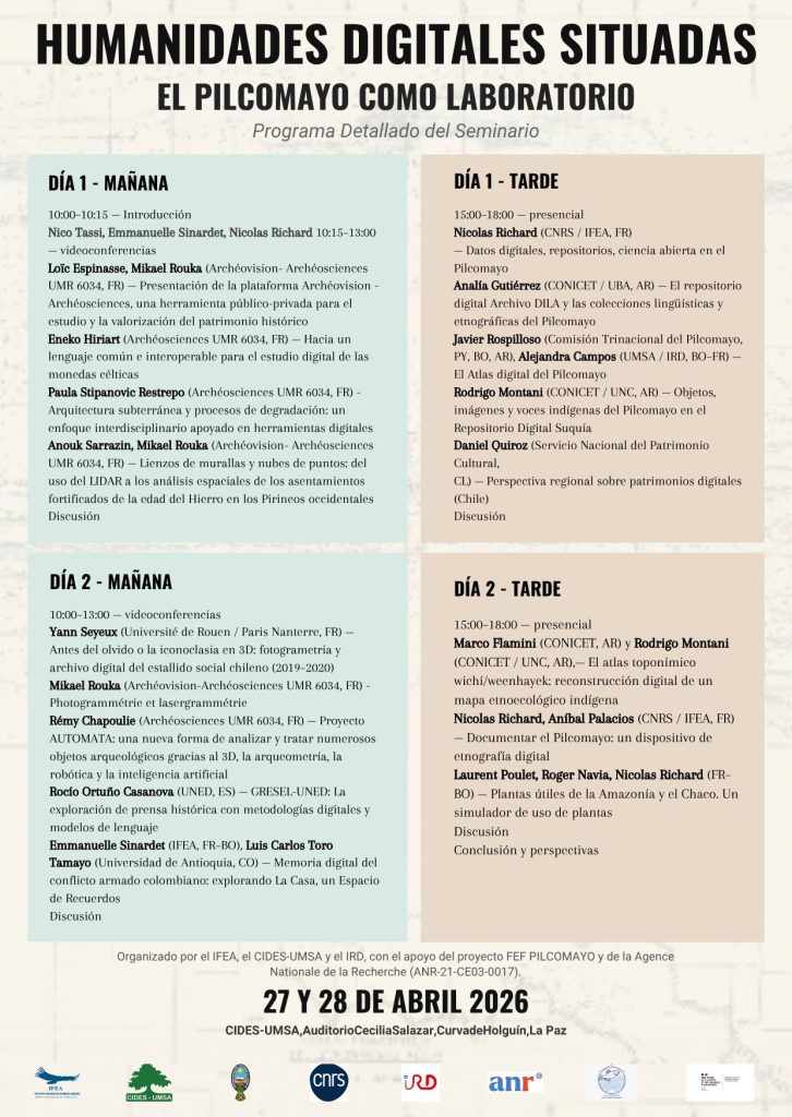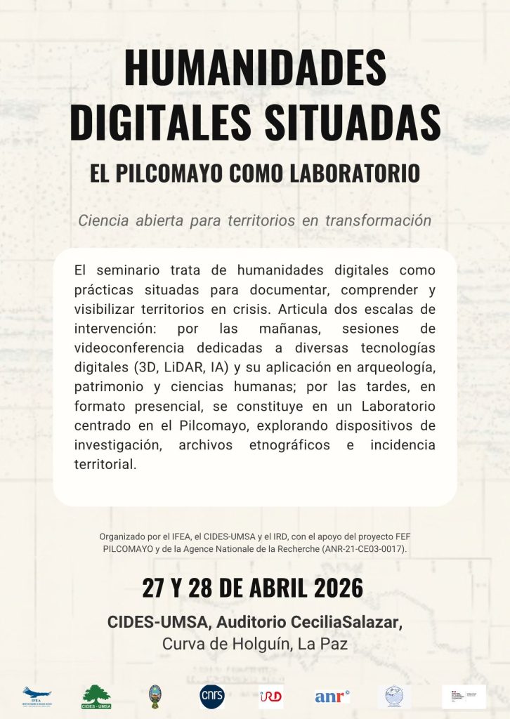 El Instituto Francés de Estudios Andinos (IFEA), el CIDES UMSA y el Institut de Recherche pour le Développement (IRD), con el apoyo del proyecto FEF Pilcomayo y la ANR, invitan al seminario “Humanidades digitales situadas: el Pilcomayo como laboratorio”, que busca crear espacios de reflexión, práctica e intercambio en torno al uso de herramientas digitales para documentar y comprender territorios en crisis.