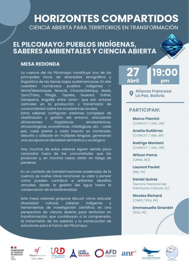 Además, en el marco de este evento, la Cooperación Francesa en Bolivia (IRD, AFD – Agence Française de Développement, Embajada de Francia en Bolivia, Lycée Franco Bolivien, Alianza Francesa de La Paz) junto al Instituto Francés de Estudios Andinos y la ANR, presentan una nueva sesión del ciclo Horizontes Compartidos, que tendrá lugar el día 📅 27 de abril a horas 19:00 pm en la Alianza Francesa📍(Sopocachi, La Paz).